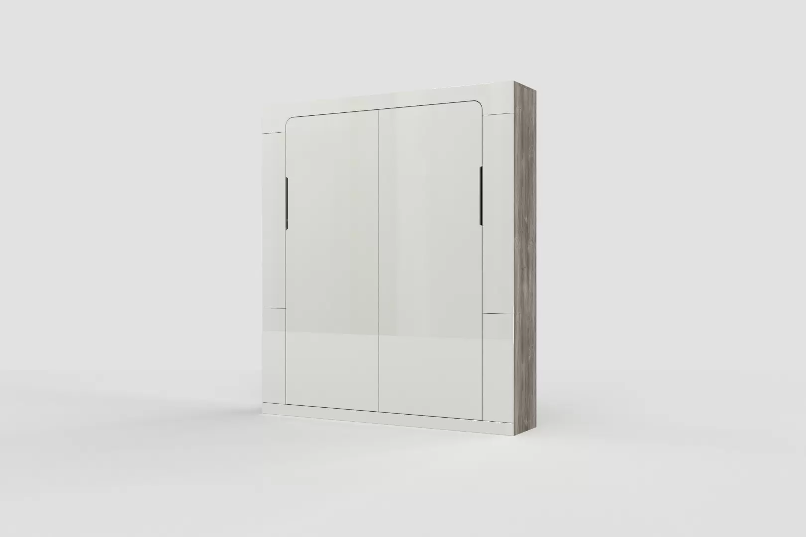 Фасад шкаф-кровати выполнен из МДФ глянец белого цвета, со сглаженными краями. Что позволит обезопасить вас от ударов при ходьбе возле кровати в разложенном положении и добавит изысканность модели шкаф-кровати. Корпус выполнен из ЛДСП декор Намибия. По бокам модель оснащена полками для хранения вещей с закрывающимися дверцами.
